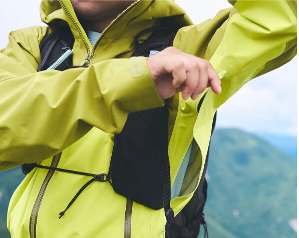 アークテリクスのジャケットは、腕を上げた際に裾がずり上がらないよう、袖が意図的に長く設計されています。