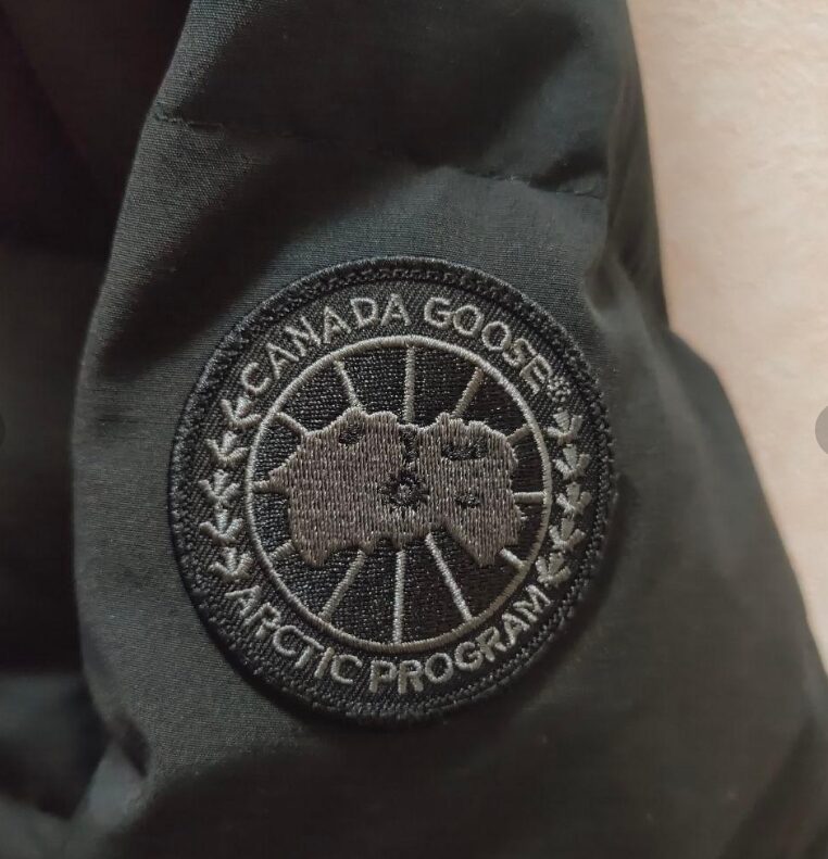 - 正規品: 刺繍がクリーンで非常に緻密。カナダの地形を示す中央の島の輪郭や、周囲のメイプルリーフの葉脈までくっきりと表現されています。「CANADA GOOSE」「ARCTIC PROGRAM」の文字もシャープで均一です。