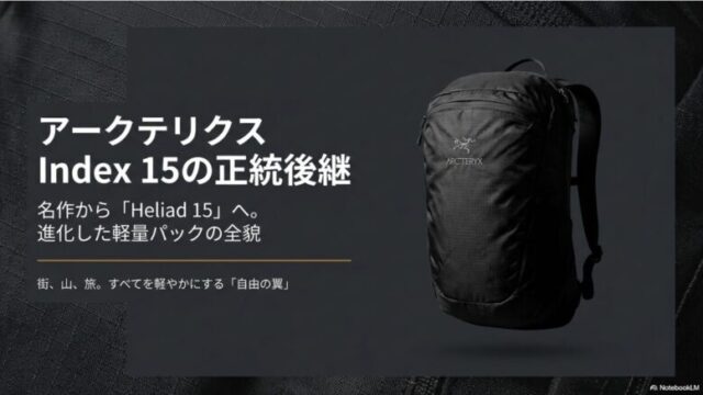 アークテリクスのインデックス15後継モデルとして注目を集めるヘリアド15を徹底解説します。旧モデルとの違いや進化したコーデュラ素材の耐久性、パッカブル機能の使い勝手を詳しく紹介。アークテリクスのインデックス15後継選びで失敗しないための注意点や在庫状況も網羅した決定版ガイドです。