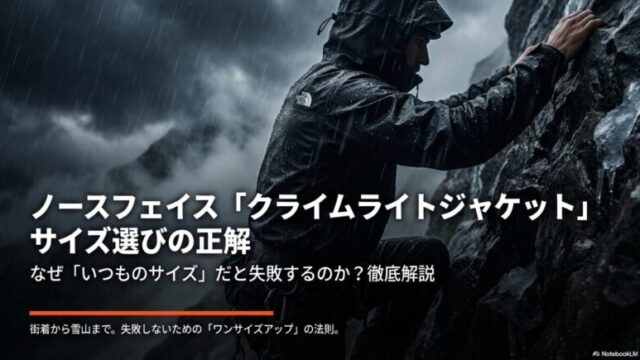 登山ウェアクライムライトジャケットのサイズ感:タイトシルエットの選び方! ノースフェイスの定番レインウェア、クライムライトジャケットのサイズ感で悩む方は多いですが、アルパイン仕様のタイトな設計を理解すれば最適な一着が選べます。この記事では身長別の推奨サイズやレイヤリングのコツを詳解。クライムライトジャケットのサイズ感の不安を解消しましょう。登山ウェア