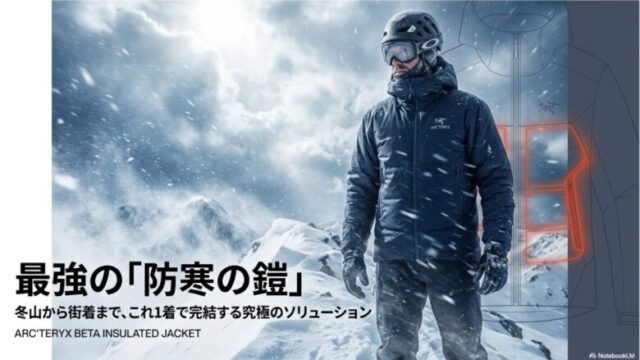 登山ウェアベータのインサレーテッドジャケットをレビュー!冬登山と街着に最強 アークテリクスのベータ インサレーテッドジャケットのレビューをお届けします。最新のゴアテックスePE素材や化繊中綿の実力を、登山好きの筆者が徹底検証しました。失敗しないサイズ選びや洗濯方法も解説。この記事のベータ インサレーテッドジャケットのレビューを読み、冬を快適にする最強の相棒を見つけましょう。登山ウェア