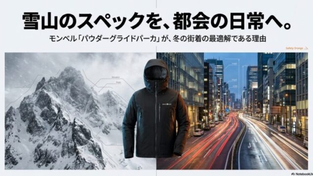 登山ウェアモンベルのパウダーグライドパーカを普段使いする魅力を徹底解説! モンベルのパウダーグライドパーカを普段使いする魅力を徹底解説。雪山スペックを都会の日常へ落とし込んだ機能性や、中綿エクセロフトの適温キープ力、街着に馴染むマットな質感を詳しく紹介します。パウダーグライドパーカを普段使いで選ぶ際のサイズ感や、通勤を快適にする活用術も満載です。登山ウェア