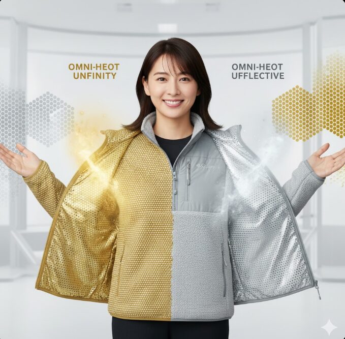 これはアルミニウムのドットが体温を反射して衣服内に戻すという、非常にダイレクトな蓄熱技術です。対して、近年登場して話題をさらっているのが、金色の裏地を持つ「オムニヒートインフィニティ」ですね。
