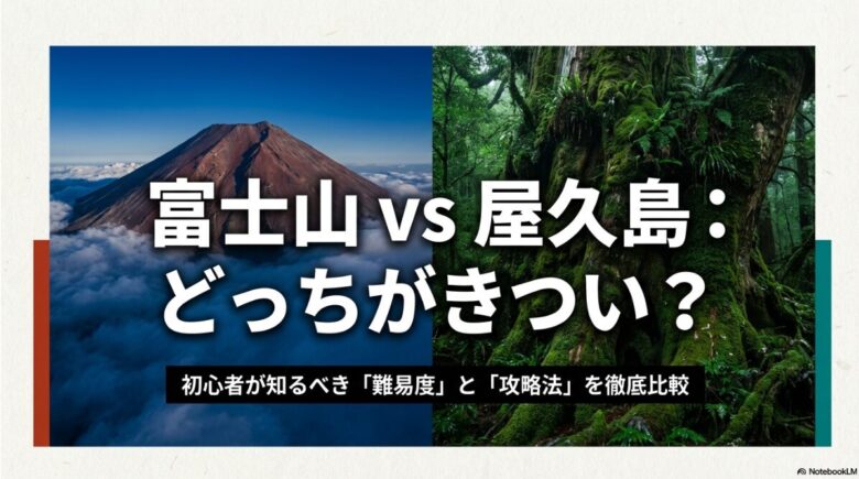 富士山登山の攻略ガイドの表紙スライド。初心者から中級者を対象とした時間管理と高度順応のテーマが記載されている登山の知識・計画関連
