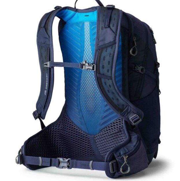 背面には、空気力学に基づく溝が施された通気孔フォームのバックパネルが採用されています。背中とパックの接触面を減らし、空気の通り道を確保することで、汗による蒸れを効果的に排出します。ショルダーハーネスにも通気孔が設けられており、酷暑の環境下でも快適さを維持してくれます。