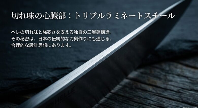 ヘレナイフの圧倒的な切れ味を支えているのが、独自の「トリプルラミネートスチール」という技術です。これは簡単に言うと、性質の異なる3枚の鋼材をサンドイッチ状に重ね合わせた構造のこと。