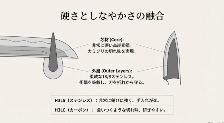 | H3LC (カーボン) | 伝統的な三層炭素鋼(バイキング等に採用) | 食いつくような切れ味。研ぎやすい | 錆びやすいため、こまめな油膜保護が必要 |