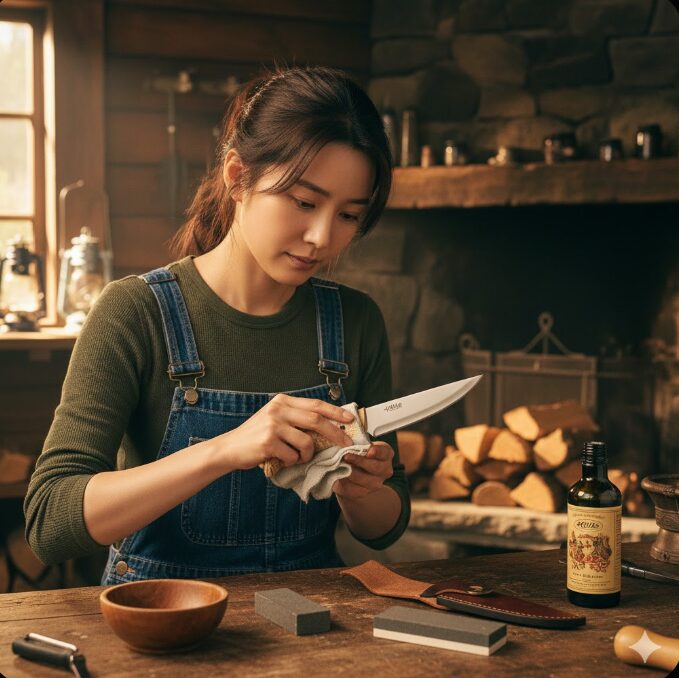 長期保管する際は、ブレードに薄く「椿油」や「ナイフ用オイル」を塗って、シースから出した状態で、風通しの良い乾燥した場所に置いておくのがベストです。シースに入れたままだと、革が空気中の湿気を吸って、思わぬ錆びの原因になることがあります。