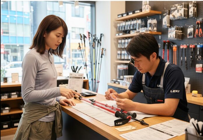 まずは購入したショップに持ち込むのが基本ですが、引越しなどで購入店が遠い場合は、近隣のLEKI取扱店(登山用品店など)でも相談に乗ってくれます。東京都内であれば「キャラバン巣鴨店」のような直営店に持ち込めば、その場で適切なアドバイスが受けられます。