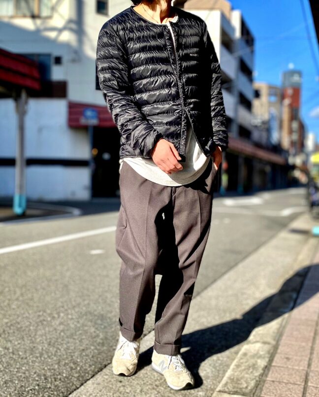 フロントジップを上まで閉め、細身のパンツ(スラックスや黒のスキニーパンツなど)を合わせると、縦のラインを強調した「Iラインシルエット」が作れます。これにより、ダウン特有の着膨れ感が抑えられ、都会的でシャープな印象になります。