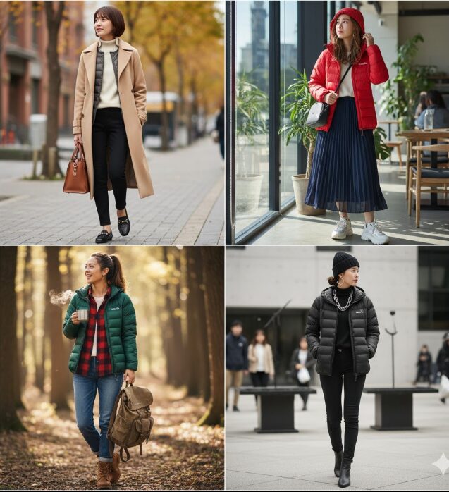 チェスターコートやトレンチコートの中に着込むのが王道です。トップスとダウンの色を同系色で揃えると、統一感が生まれて上品な印象を保てます。きれいめなワンピースの上にカーディガン感覚で羽織るのも良いでしょう。 - カジュアルアイテムとの重ね着: