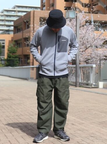 男性のコーディネートで最も意識したいのは、シルエットのメリハリです。マウンテンジャージは上半身をコンパクトに見せてくれるため、ボトムスには対照的に、少しゆとりのあるものを選ぶとバランスが整います。