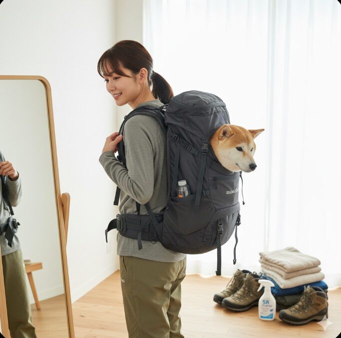 リュック自体の調整だけでなく、中の「重心」も意識してみましょう。犬が後ろ側に寄ってしまうと、テコの原理で飼い主の肩に大きな負担がかかります。