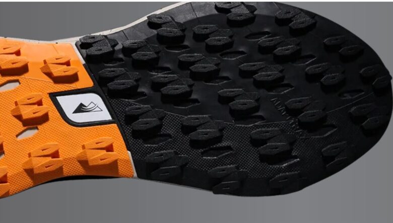 また、ラグ(突起)の形状にも計算し尽くされた工夫があります。前足部には登りで地面を力強く蹴り出すための形状を、かかと部には下りで確実にブレーキをかけるための形状を配置。