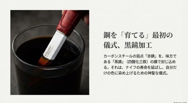 黒錆(四酸化三鉄)は、赤錆とは異なり、鉄の表面を緻密な皮膜で覆って内部の腐食を守ってくれる「良いサビ」です。これを意図的に発生させることで、ナイフの寿命を延ばし、メンテナンスを楽にすることができます。
