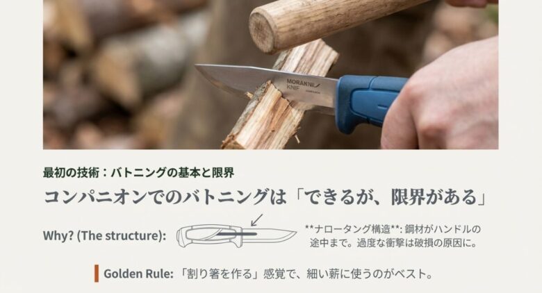 キャンプの醍醐味といえば焚き火、そして焚き火の準備に欠かせないのが薪を割る「バトニング」ですよね。モーラナイフのコンパニオンでバトニングができるかどうか、という問いの答えは「基本的にはできるけれど、限界がある」という点に尽きます。