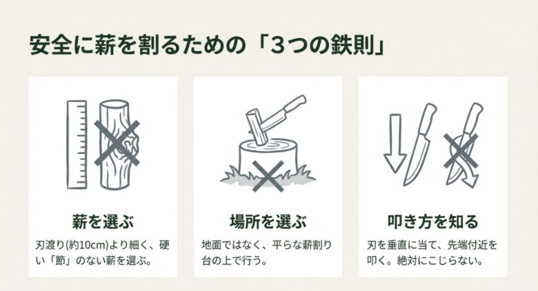 安全にバトニングを楽しむためのテクニックとしては、まず「節(ふし)」のある木材を避けることが鉄則です。節は非常に硬く、無理に叩くと刃が欠けたり、ハンドルと刃の接合部に大きな負荷がかかってしまいます。