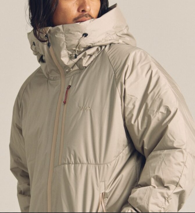 つまり、保温性よりも「軽さと携帯性」に全振りしたモデル。フードに本体を収納できるパッカブル仕様 でもあるので、旅行や登山の「念のため」の防寒着としてカバンに忍ばせる、といった「ファスト&ライト」志向のテクニカルな別注と言えます。