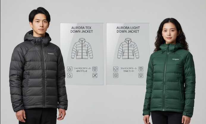- 「標準オーロラ(街着・耐久性)」と「オーロラライト(アクティブ・高透湿)」という生地性能の根本的な違い