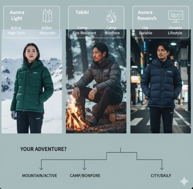 一番大事なのは、「オーロラ」と「オーロラライト」と「タキビ」は、全く別の用途のジャケットだと理解することです。そこさえ間違えなければ、あなたの使い方に最適な一着が、「インライン」なのか「別注」なのか、自ずと見えてくるはずです。