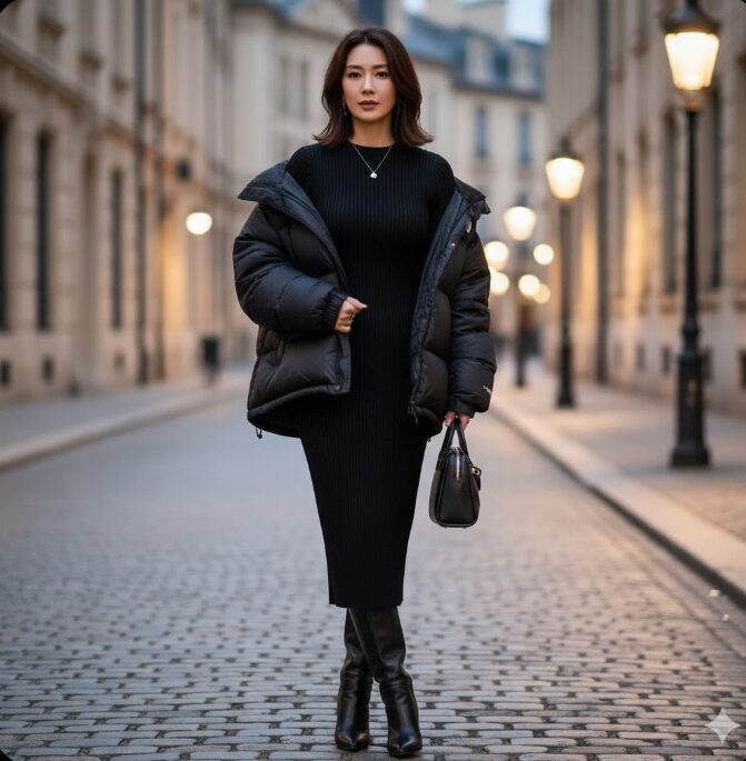 - 丸みのあるシルエット:裾がすぼまることで、全体のシルエットが「Iライン(寸胴)」から「丸みのあるコクーンシルエット」に変わり、女性らしさが出ます。