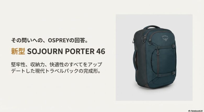 46リットルというゆとりある容量、中身をガッチリ守るストレートジャケット機能、そして大幅に改善された背負い心地。これらがハイレベルで融合したソージョンポーター46は、まさに現代トラベルパックの正解の一つと言えるでしょう。