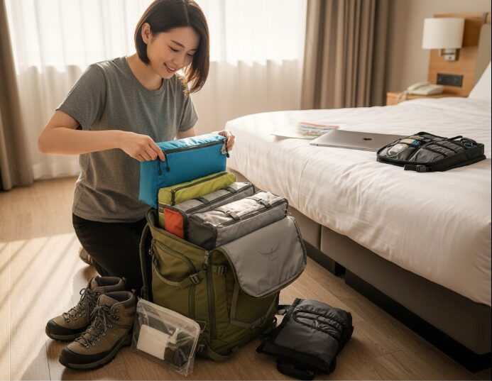 特にオスプレー純正の「ULパッキングキューブ」などは、ポーターの内寸に合うように設計されているので相性が抜群です。重いもの(予備の靴や重いガジェット類)をバッグの底(背負った時に下に来る側)ではなく、できるだけ背中側の中央付近に配置するのが、背負い心地を良くする最大のコツです。