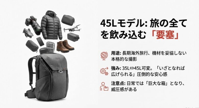 - 45Lモデル: 長期旅行、大量の機材を運ぶプロフェッショナル、お土産スペースを確保したい人に最適。ただしLCCの重量制限には細心の注意が必要。