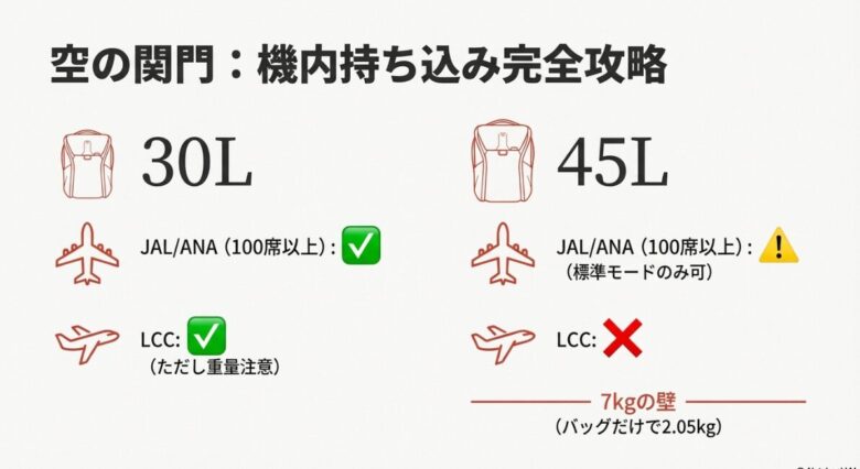 まず、JALやANAなどの主要航空会社(100席以上の機材)であれば、30Lモデルはサイズ規定(55cm × 40cm × 25cm以内)を完全にクリアしており、問題なく持ち込めます。