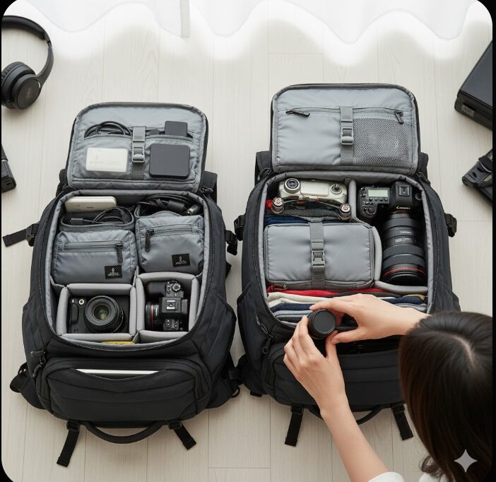 一方、30Lモデルの場合は注意が必要です。30Lでカメラキューブ「Medium」を使うと、残りのスペースは上部にわずかに残るのみで、他の荷物がほとんど入らなくなります。30Lを旅行で使うなら、カメラキューブは「Smedium(スミディアム)」または「Small」に抑え、残りのスペースを着替えやお土産用として確保するのが賢い運用方法です。