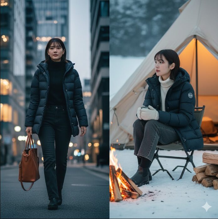 - ビジネスカジュアルの進化:前述の通り、スーツやジャケットとの相性は抜群ですが、ファーがないことでよりスマートな印象になりました。タイドアップスタイルはもちろん、タートルネックニットと合わせた現代的なオフィスカジュアルにも、より自然に溶け込みます。