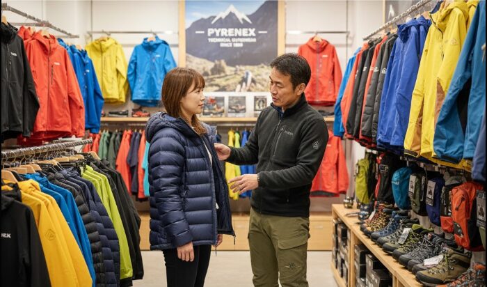 前述の通り、ピレネックスはフランスのブランドのため、日本人の体型に合わせたサイジングとは異なる場合があります。専門店では、実際に厚手のフリースやセーターを中に着込む「レイヤリング」を想定した上で、適切なサイズ感を確かめることができます。