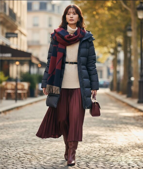 さらに、異素材をミックスすることも重要なポイントです。ダウンのマットなナイロン素材に対して、光沢のあるサテンスカートや、温かみのあるウールのパンツ、リッチな印象を与えるレザーの小物を組み合わせることで、質感のコントラストが生まれ、コーディネートに深みとリズム感が生まれます。