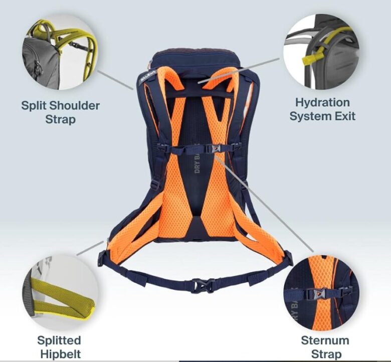 「ALP TRAINER 25」などのモデルに採用されている「AIR FIT 2.0」という背面システム 。これは、背中とバックパックの間にあえて空間を作り、背中と接地する箇所にはメッシュパッドを配置しています。