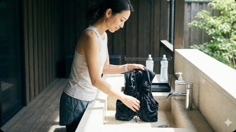 ランニング後のハイドレーションベストは、大量の汗と皮脂、そして埃を含んでいます。これを放置すると、強烈な臭いの原因になるだけでなく、生地の劣化を早めてしまいます。正しいケアで寿命を延ばしましょう。