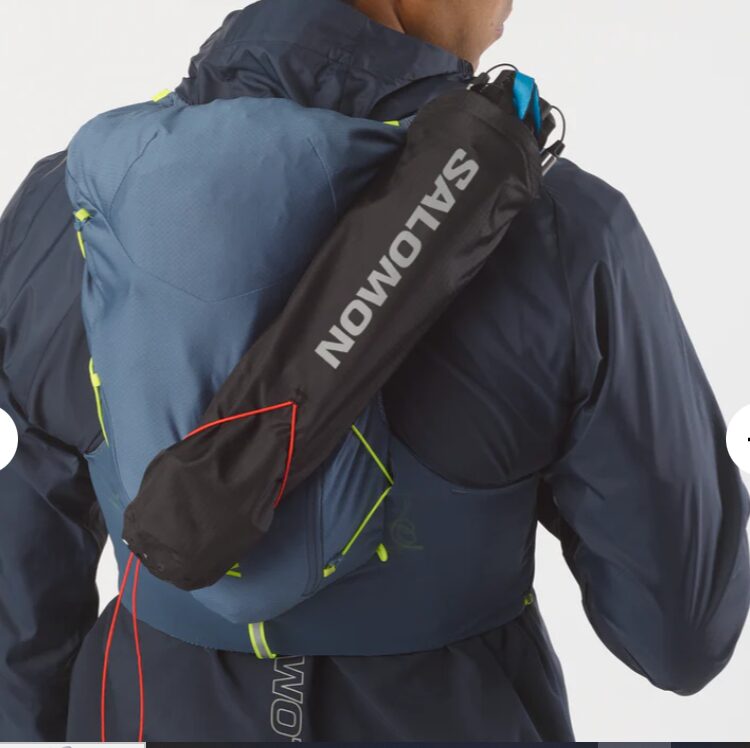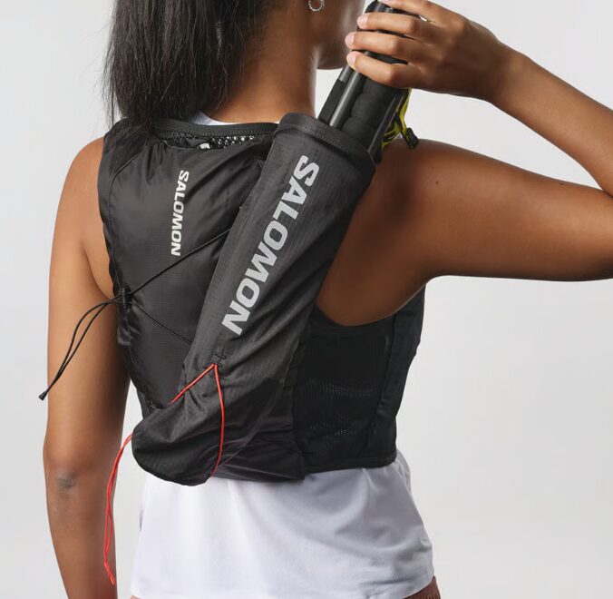 このストローのおかげで、ランニング中に顔を下に向けたり、ベストを持ち上げたりすることなく、ストローを口に近づけるだけで給水が可能になります。これは実際に使ってみると非常に便利で、首への負担も減ります。
