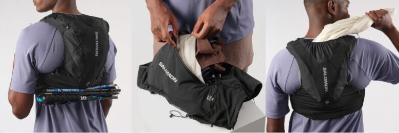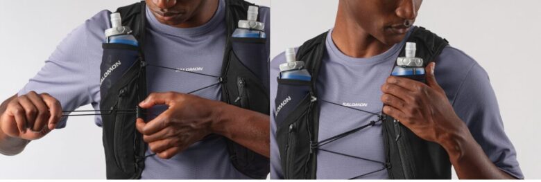 サロモンのベストには「SensiFit」という構造が採用されています。これは、伸縮性のある素材と非伸縮性の素材を解剖学的に配置することで、呼吸を妨げずに体にフィットさせる技術です。この機能が優秀すぎるため、多少サイズが小さくてもゴムが伸びてフィットしてしまいますし、逆に大きくてもある程度は着れてしまいます。