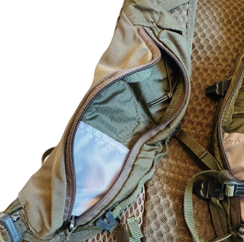 右側のショルダーストラップには大型のジッパーポケットが付いており、ここにスマホ(iPhone Pro Maxクラスもギリギリ入ります)、行動食のジェル、鍵などを収納できます。登山中に「あ、綺麗な景色!」と思った瞬間、ザックを下ろさずにスマホを取り出して撮影し、すぐにしまって歩き出せる。このスムーズさは一度体験すると戻れません。