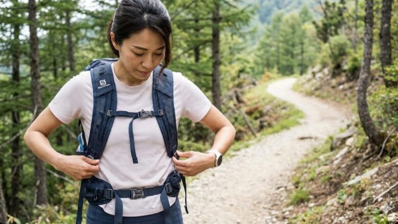 - ウエストベルトの位置:骨盤ではなく、「お腹(腹筋の上、みぞおちの下)」の高い位置で締めてください。ここが支点となり、ザックのボトム部分が左右に振れるのを防ぎます。