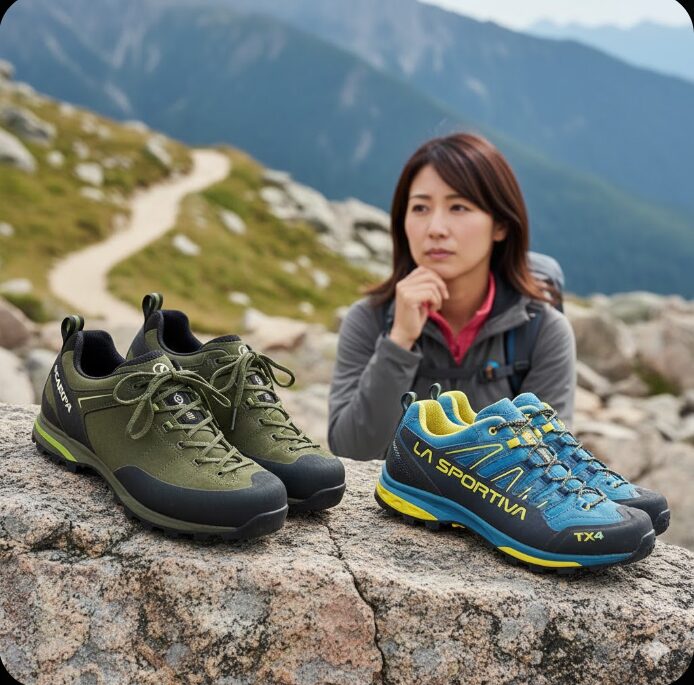 アプローチシューズ選びで必ずと言っていいほど比較対象に挙がるのが、同じイタリアのスポルティバ(La Sportiva)です。特に「TX4」や「TX5」シリーズは強力なライバルですが、私から見たスカルパ製品の決定的な違いは、「足裏感覚の繊細さ」と「職人気質の堅牢性」にあります。