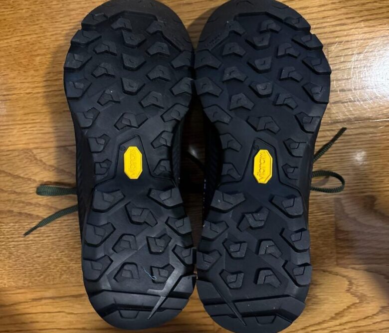 そして、アウトソールには信頼と実績のVibram Megagrip(メガグリップ)コンパウンドが採用されています。これは乾燥した岩肌はもちろん、雨で濡れた花崗岩や、登山道特有の濡れた木の根、泥質の斜面でも驚異的な摩擦力を発揮します。