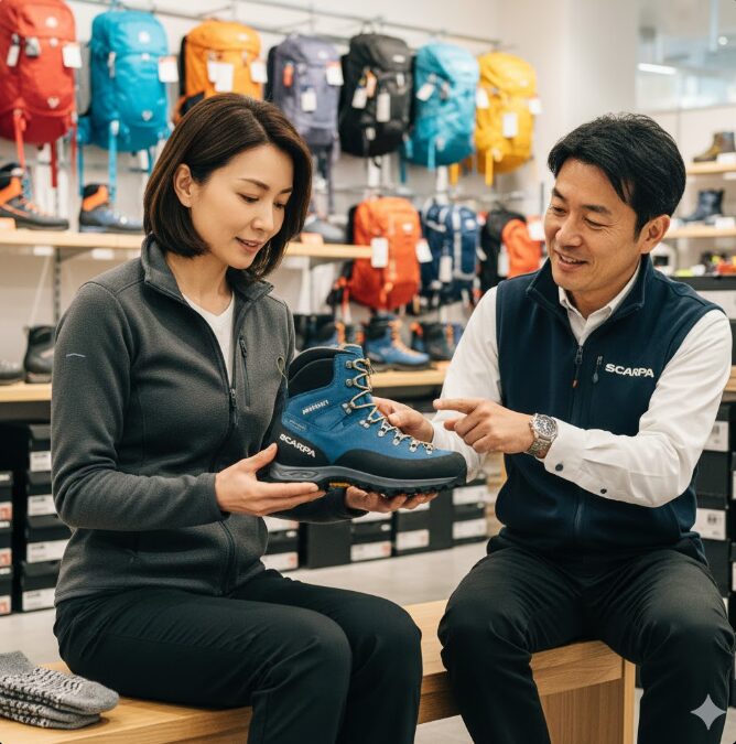 - 冬用ソックス持参で試着: 必ず実際に山で使用する予定の厚手ソックスを持参(または店頭で借用)して試着してください。