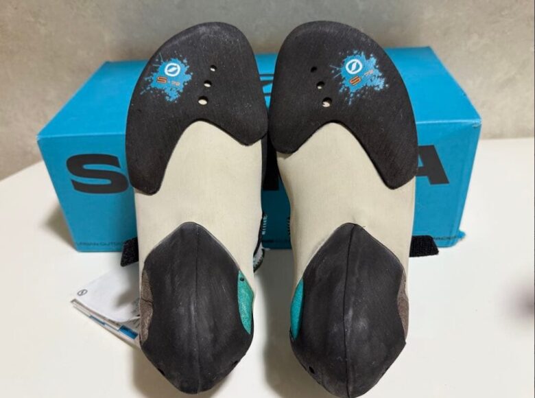 特に、まだ足置きが定まっておらず、壁を擦るように登ってしまう初心者の場合、数ヶ月、早ければ3ヶ月程度でつま先のゴムがなくなってしまうこともあります。