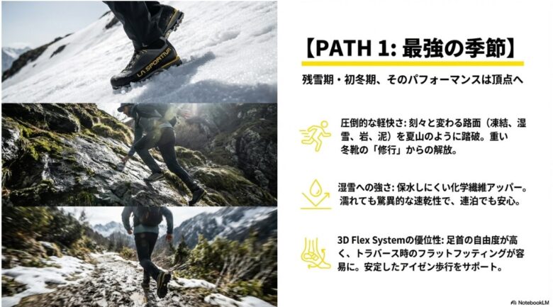 この靴が「雪山で使えるか?」という問いに対する答えは、イエスでもありノーでもあります。重要なのは、どの時期の、どのレベルの雪山に行くかというマッチングです。