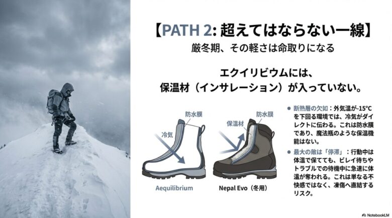 「軽いから冬もこれで!」と安易に投入するのは危険です。なぜなら、エクイリビウム(TOP/LT/ST含む)には、基本的に保温材(インサレーション)が内蔵されていないからです。