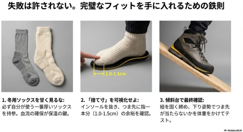 雪山登山において、靴擦れや圧迫による痛みは、夏山以上に深刻な問題です。寒さで感覚が鈍っている間にダメージが進行したり、痛みのために歩行ペースが落ちて遭難のリスクを高めたりするからです。失敗しないサイズ選びのために、以下のポイントを必ず押さえておきましょう。