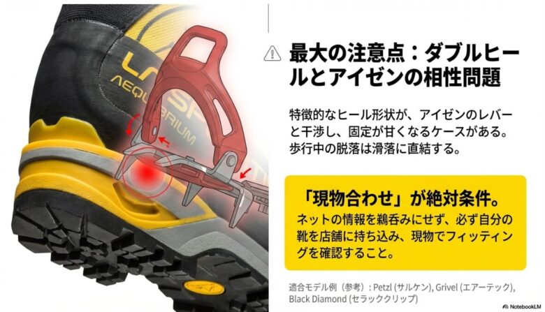 ダブルヒールのリアブロック(突起)が邪魔をして、アイゼンのヒールレバーが完全に下がりきらなかったり、コバへの掛かりが浅くなってしまったりするケースが報告されています。また、ソールの幅が土踏まず付近で急激に絞り込まれているため、アイゼンのヒールカップの形状によっては、左右にガタつきが生じることもあります。