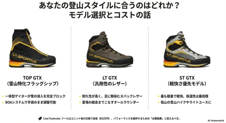 しかし、保温性はシリーズ中で最も低く、アッパーも薄いため、雪山でのハードユースには少々心許ない部分があります。日帰りの低山雪山や、チェーンスパイクを使うようなライトな雪山ハイクには最適ですが、本格的なアイゼンワークを伴う高山には不向きかもしれません。