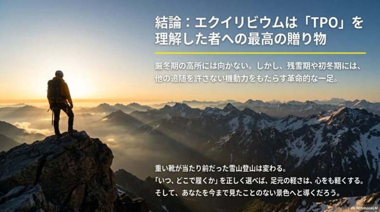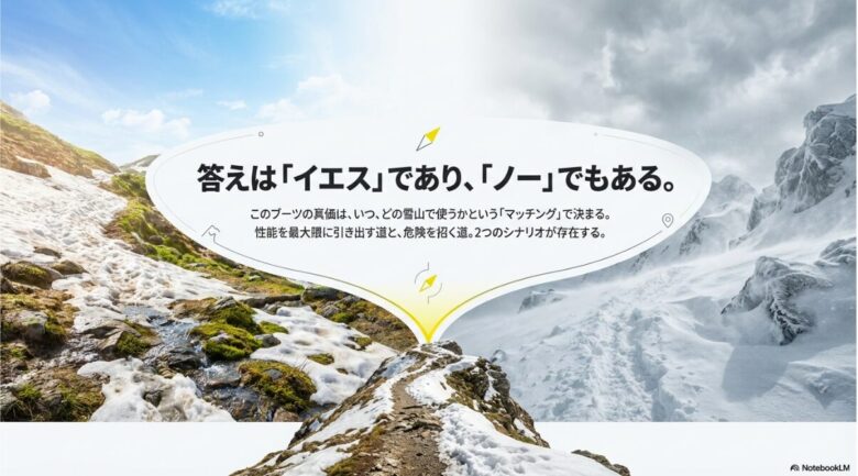 まとめると、この靴は「厳冬期の高所登山には向かないが、残雪期や初冬期、あるいは低山の雪山においては、これまでにない機動力をもたらしてくれる革命的なブーツ」だと言えます。