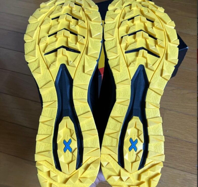 アウトソールのラグパターンには「インパクトブレーキシステム」という技術が使われており、斜めに配置されたラグが、登りではしっかりと地面を噛んで推進力を生み、下りではブレーキをかけるように作用します。ラグの高さは中程度ですが、その配置の妙により、見た目以上のトラクションを発揮してくれます。